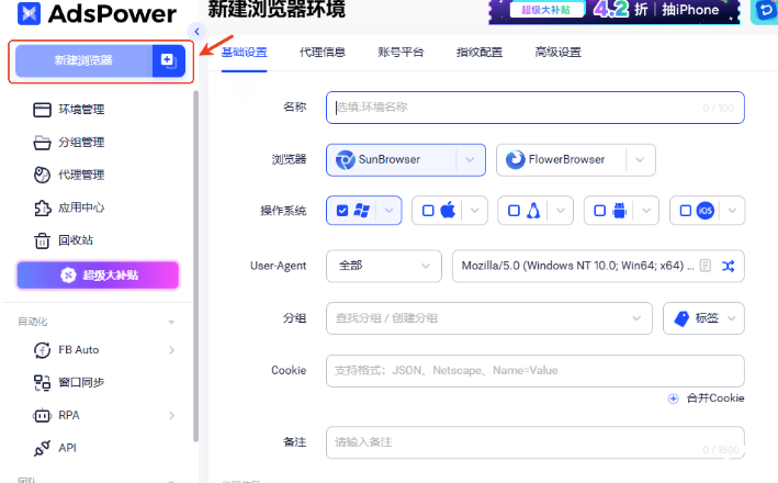 打开 AdsPower 客户端 → 点击 新建浏览器。