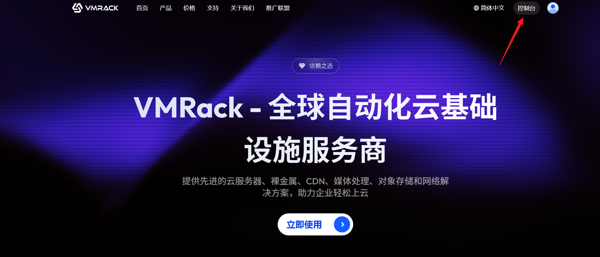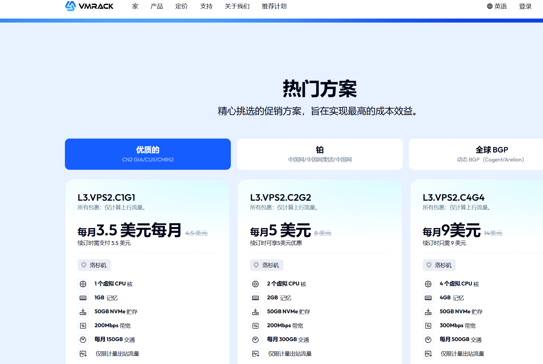 首先利用邮箱进行个人账号的注册(无需实名),注册成功后看需要VPS还是CDN还是裸金属,我们要在页面官网VMRack的导航栏进行寻找,如果是寻找VPS那我们就直接点击即可(如下图)。
