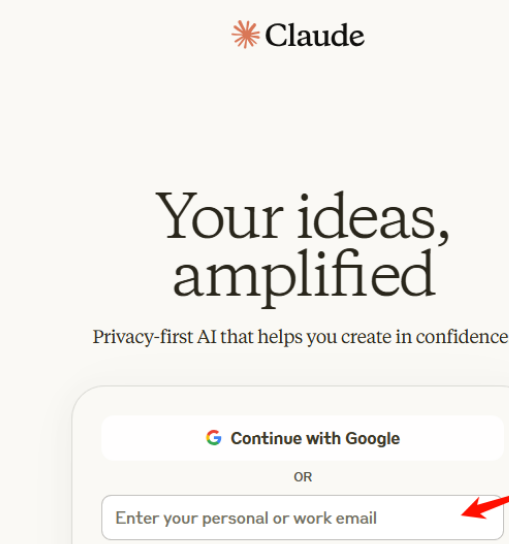 首先,你需要进入 Claude 的官方网站:https://claude.ai。在官网上,你会看到两种注册方式:Google 账号注册或邮箱注册。这里我们选择邮箱注册,点击“Continue with email”按钮开始。