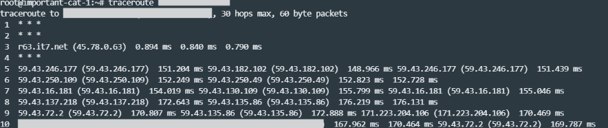 去程路由追踪是指从你的客户端(比如家用宽带、公司网络)到VPS服务器之间的路由路径。我们可以使用Traceroute工具来查看路由路径。