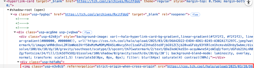 经过一番深入分析后,我决定不再继续纠结于为什么<hyperlink-card>标签默认会使用no-referrer。其实,解决问题的方法很简单,只需要修改referrerpolicy的值,就能让图片正常加载。