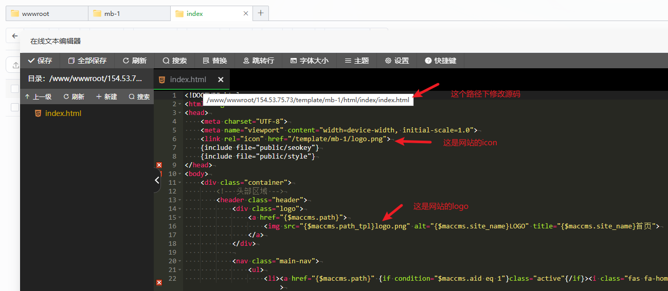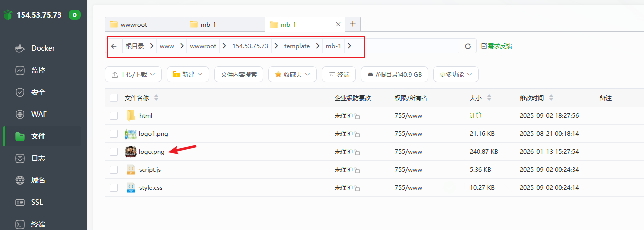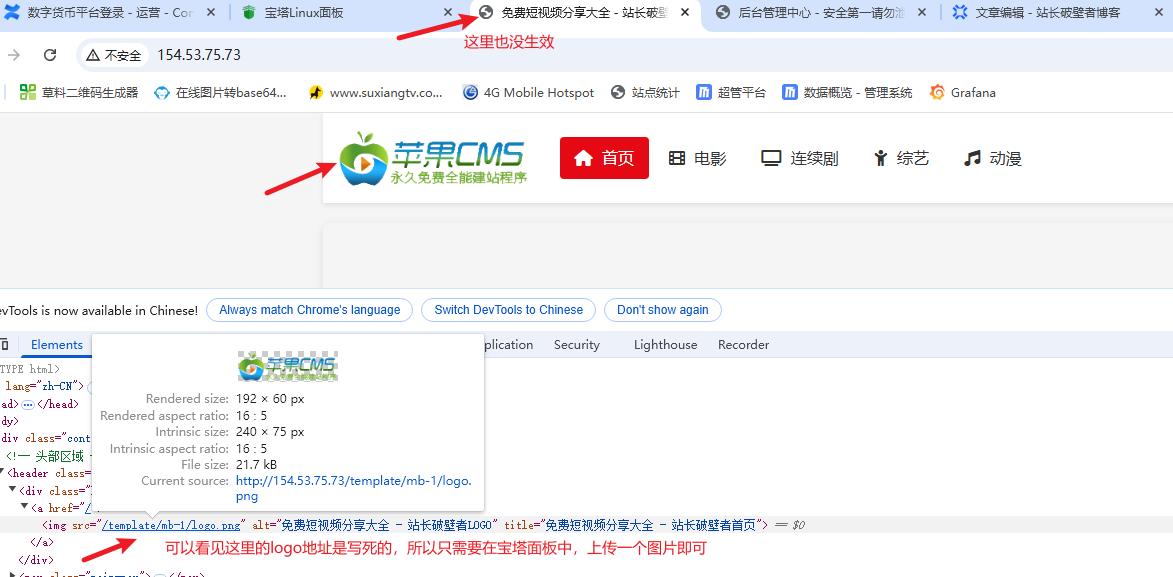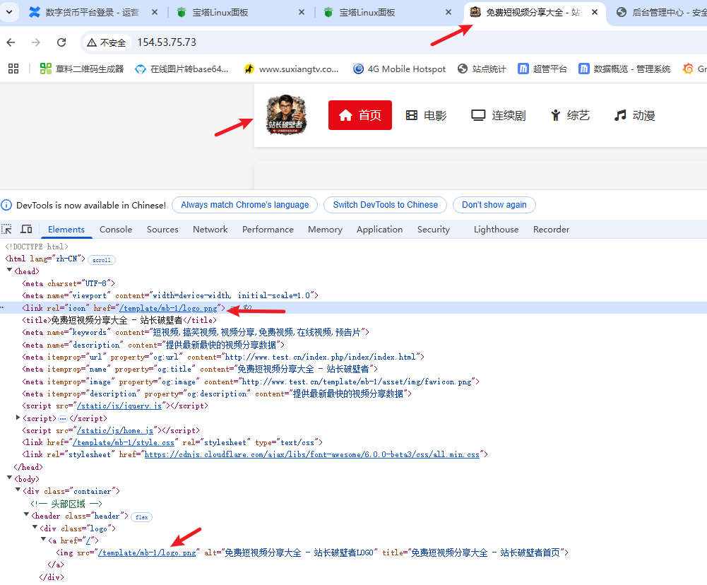 访问网站首页,发现刚才设置的logo并没有生效,检查代码发现,logo是固定写死的,所以我们在宝塔面板中,重新上传logo即可。