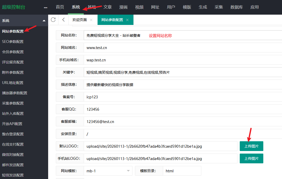 登录管理后台,在系统->网站参数配置中修改网站的基本信息。
