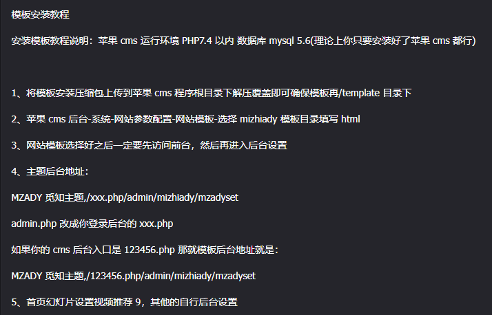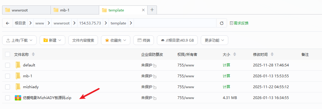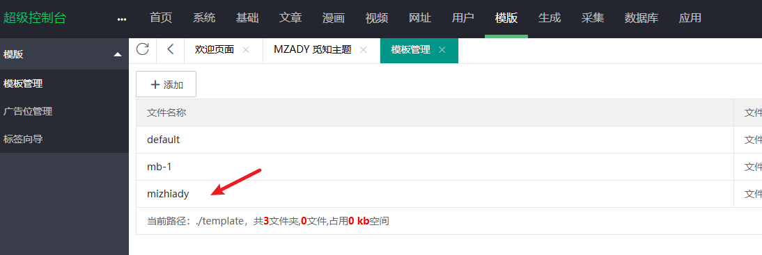上传模板源码到网站template目录,解压后把mizhiady文件移动到template下即可: