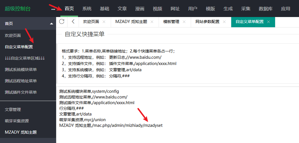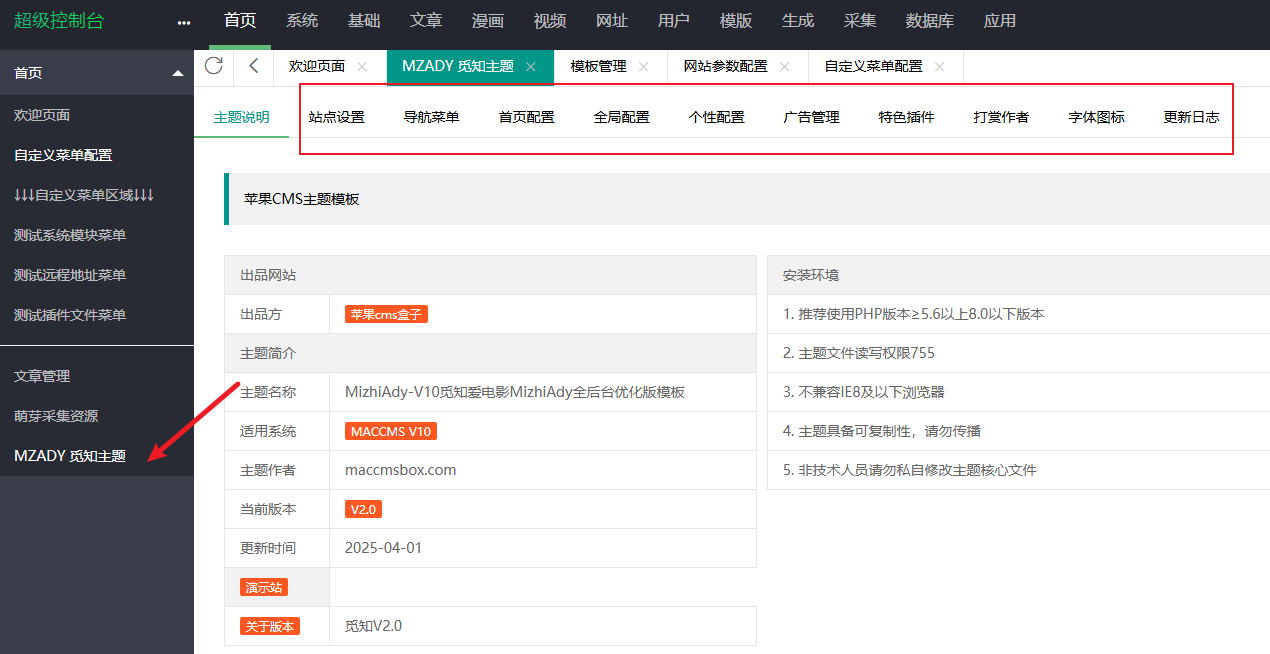 保存后,刷新管理后台,发现左侧菜单新增MZADY主题,进入主题,可以进行相关设置: