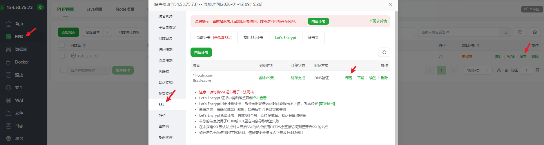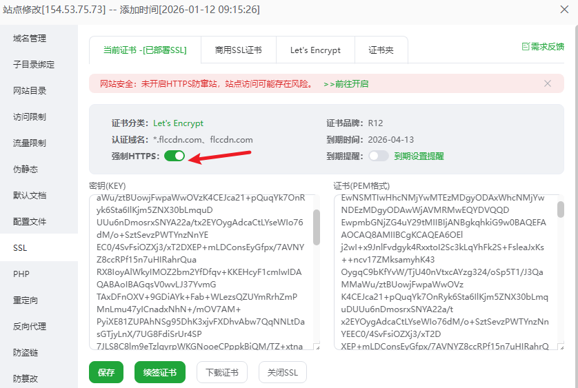 此时,浏览器提示不安全,是因为网站未设置SSL证书,接下来,继续为网站设置证书。为什么给网站需要设置证书?这里简单说明下,设置证书后网站会更安全。