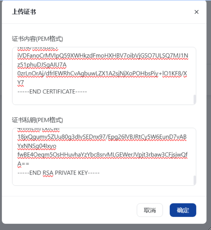 博主这边已经在海外云服务器 VMRack 申请了证书,就点击上传证书。如下图: