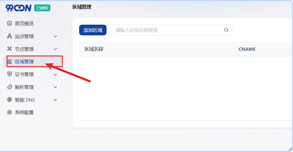 1、登录99CDN控制面板,点击区域管理。如下图: