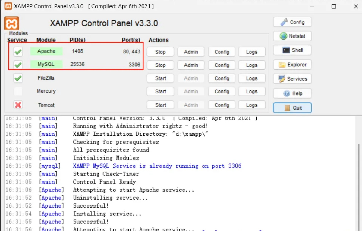 C:\Program Files),本指南使用D:\xampp安装完成后,启动XAMPP控制面板