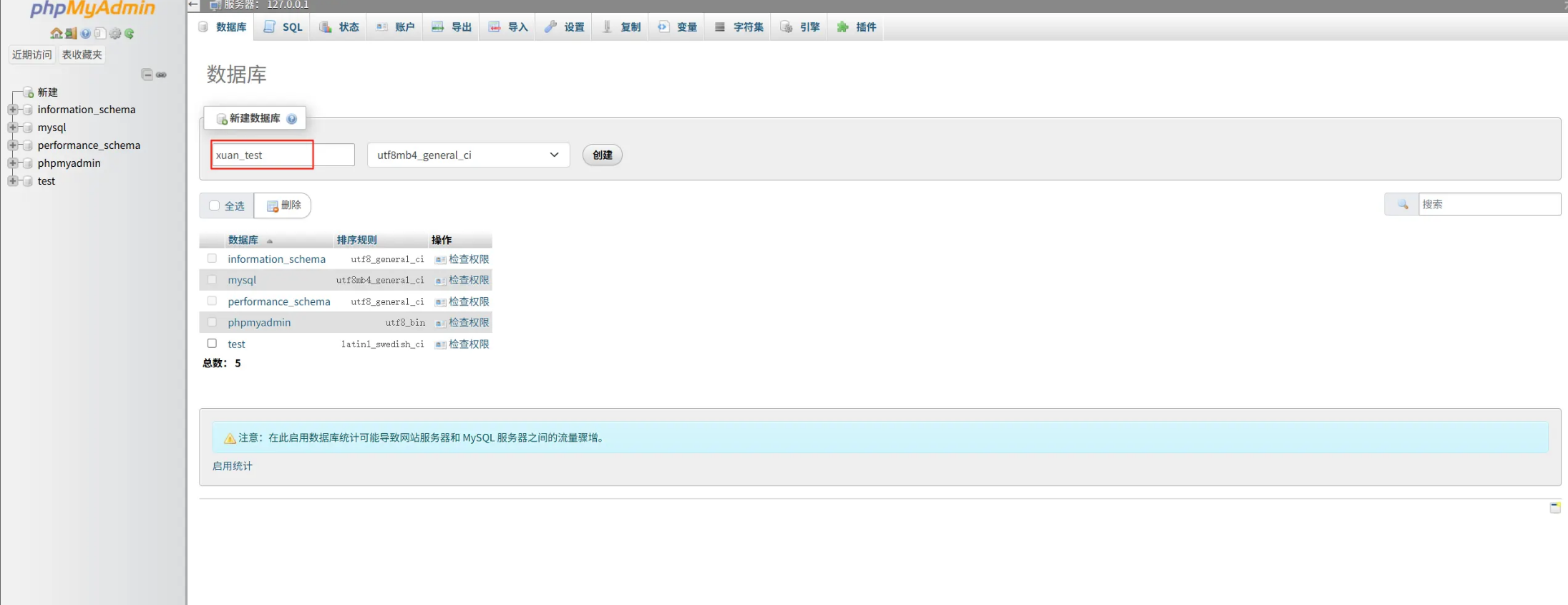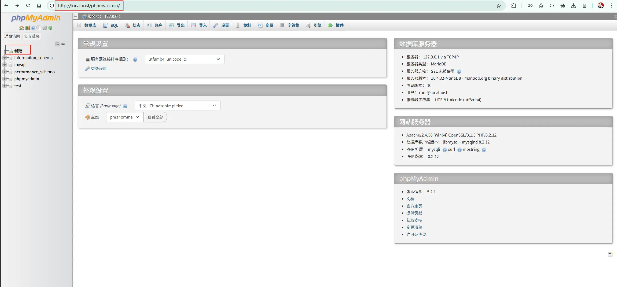 http://localhost/phpmyadmin/进入数据库管理界面点击左侧导航栏中的"新建"选项