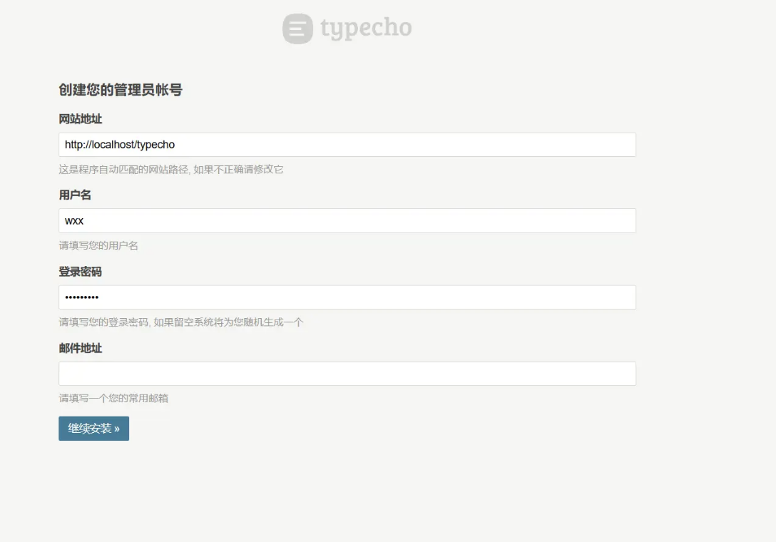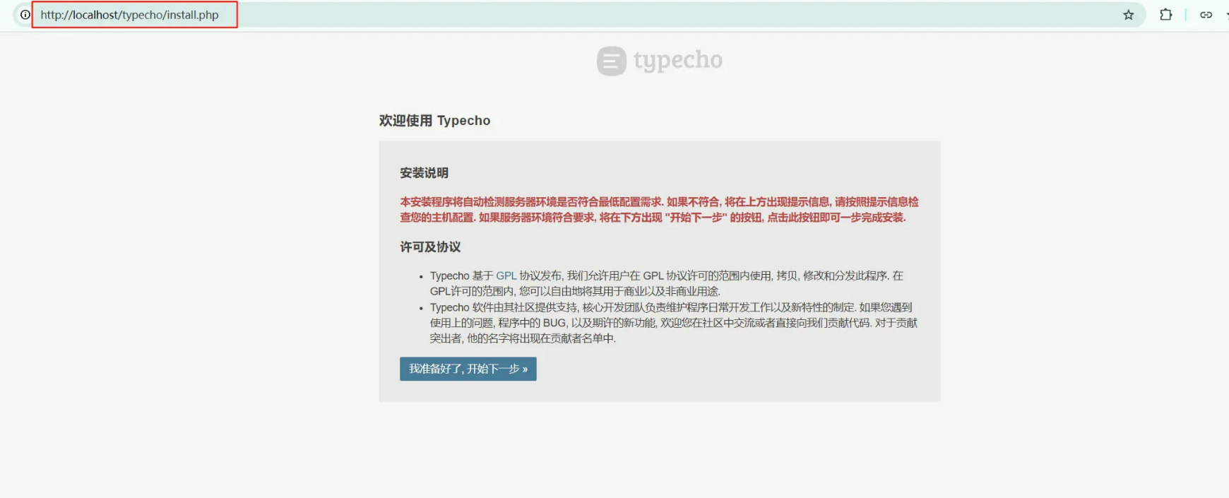 http://localhost/typecho/启动安装程序在欢迎页面点击"我准备好了,开始下一步"