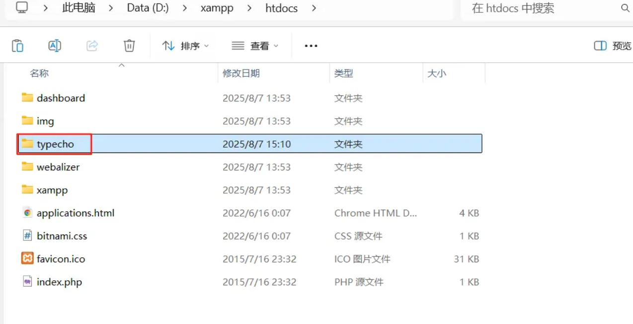 DocumentRoot并找到以下配置:# 原配置 DocumentRoot "D:/xampp/htdocs" <Directory "D:/xampp/htdocs">修改为指向Typecho目录: