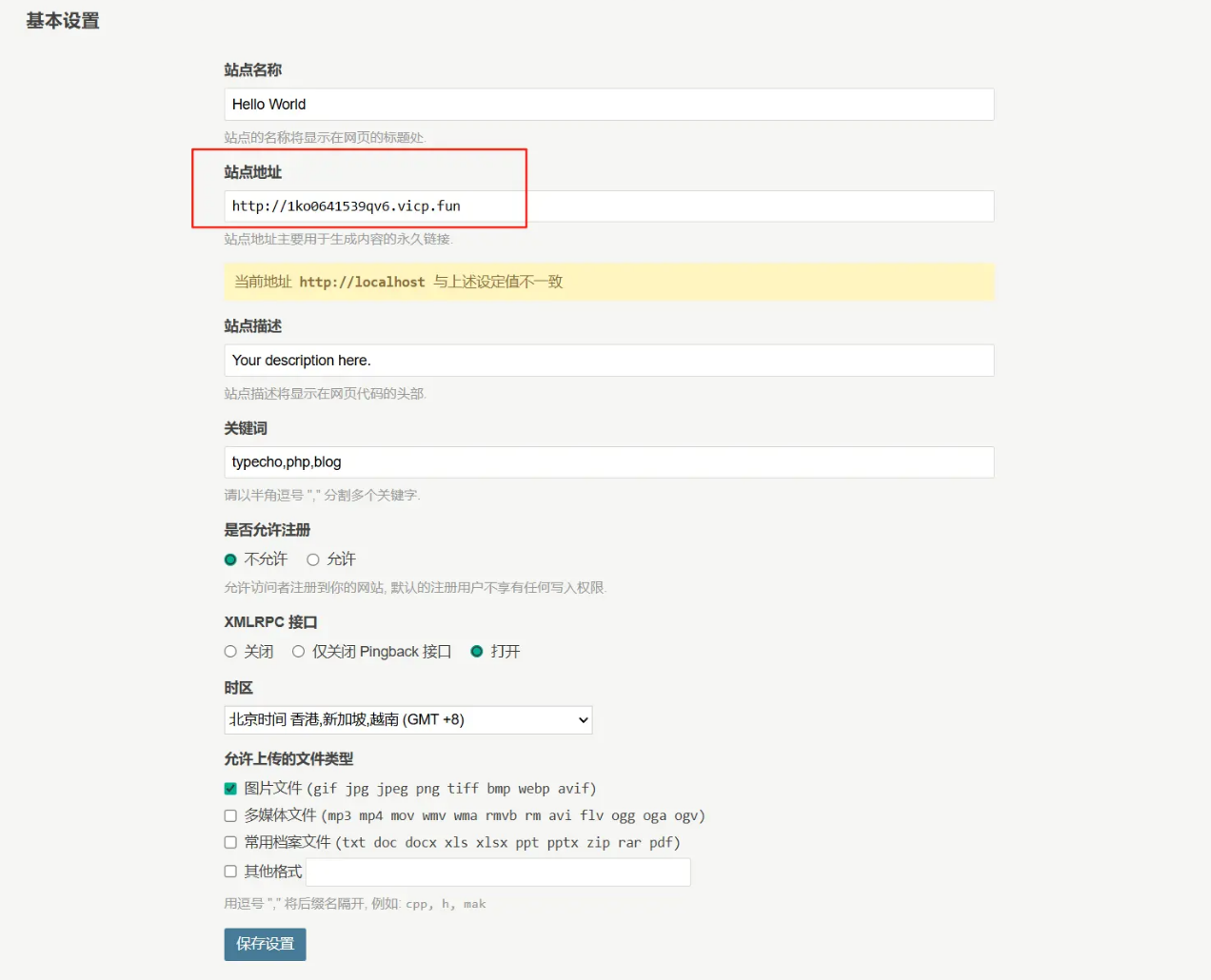 当您通过任何域名或 IP 访问博客时,需要确保 Typecho 知道自己的正确地址,否则样式和链接可能无法正常工作: