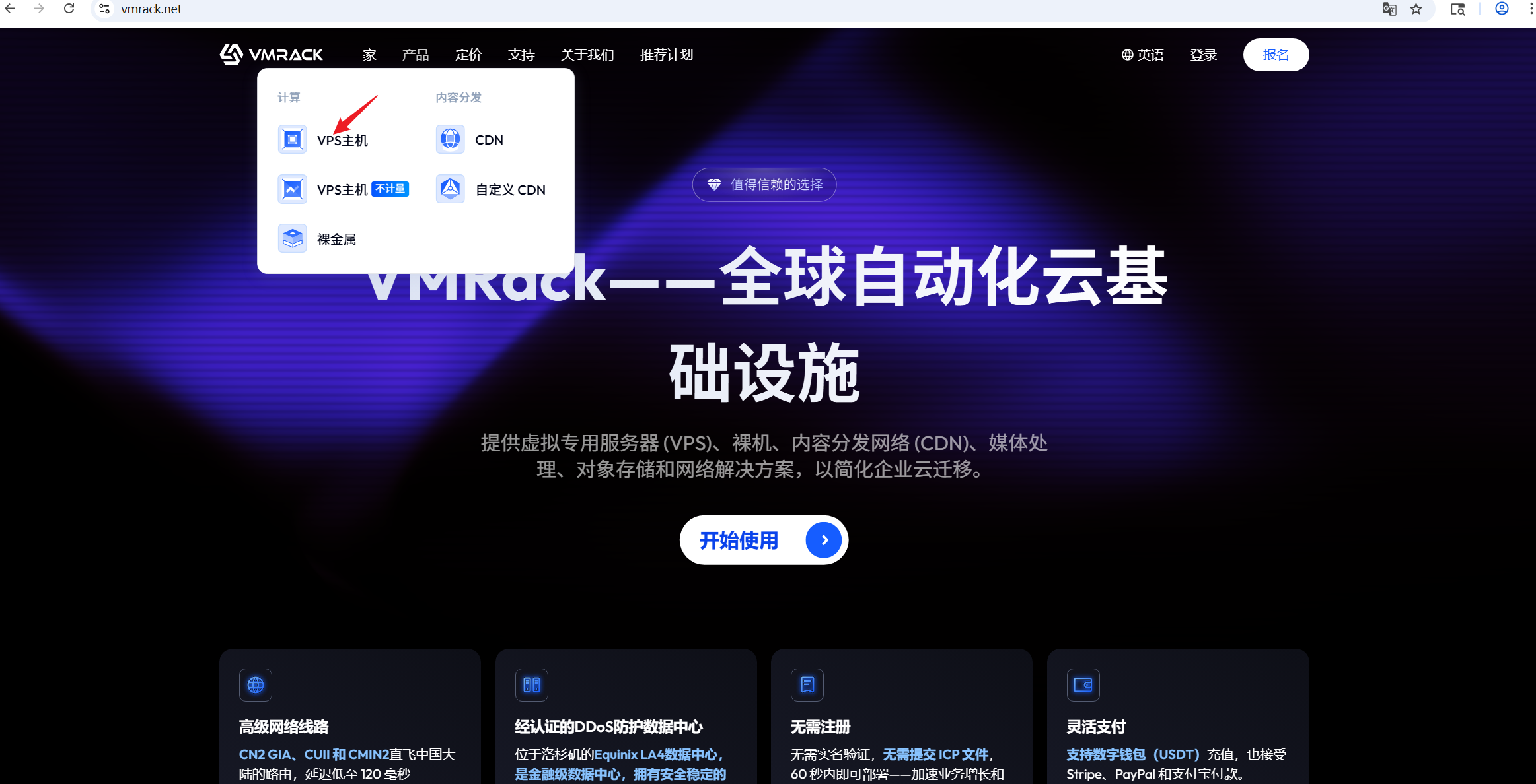 首先利用邮箱进行个人账号的注册(无需实名),注册成功后看需要VPS还是CDN还是裸金属,我们要在页面官网VMRack的导航栏进行寻找,如果是寻找VPS那我们就直接点击即可(如下图)。